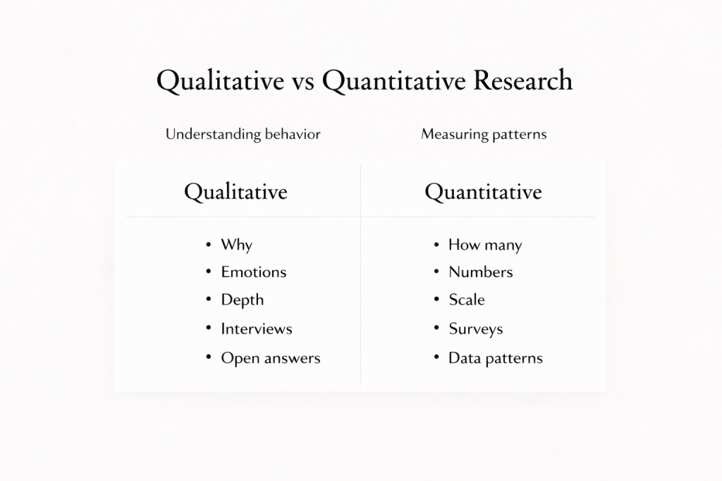 Quantitative research, on the other hand, helps you measure things at scale. It answers questions like how many, how often, or how much.